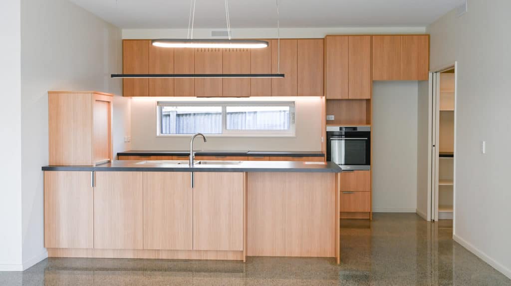 Snuggled between the two wings is a 7.5x8m kwila deck, which offers views without the prevailing wind. It’s the ultimate outdoor entertaining area from which to enjoy this special setting. Due to the clever floorplan, the house accommodates three bedrooms, two living spaces, two tiled bathrooms and plenty of storage. The designer kitchen, with a bonus scullery, is compact but user-friendly.